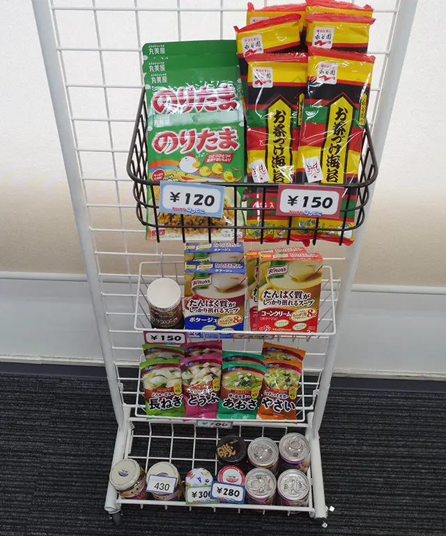 - オフィス内のちいさなコンビニは、食品や飲料、日用品を幅広く取り揃えています。季節ごとの新商品もあり、毎日新しい発見があります。働く皆さんのちょっとした楽しみになること間違いなしです。