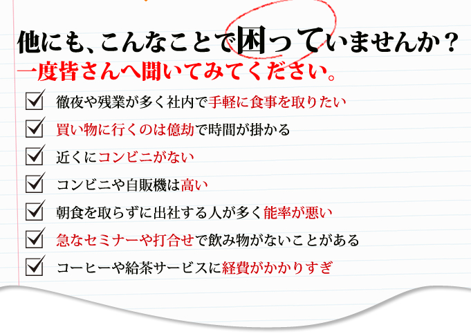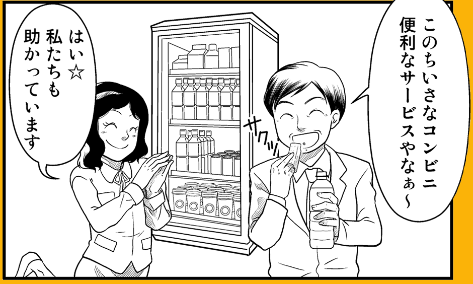 | 通信販売業者 様 設置前は自動販売機が同じフロアに無かったのでビルの1階まで下りるかコンビニに買いに行っていましたが、ちいさなコンビニがあると喉が渇いたときにすぐ購入できるので時間が無いときでも利用できます。そこで面倒臭がりな人やフロアに自動販売機が無い会社にちいさなコンビニをお勧めします。 |